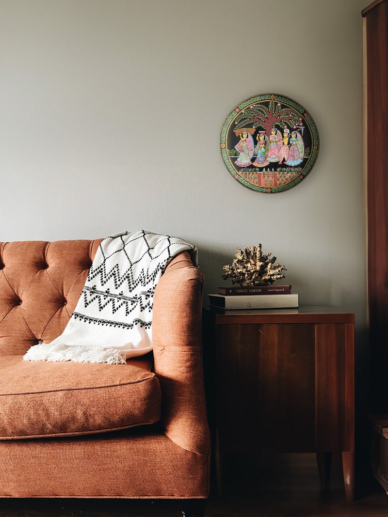 A beautifully crafted Tikuli art plate portraying a rural village scene with women carrying harvest baskets and tools beneath a flowering tree. The detailed figures, ornate borders, and rich earthy tones highlight traditional attire and everyday life, reflecting the charm and cultural depth of Indian folk art.