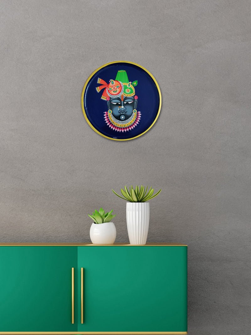 A striking Pichwai-style decorative plate featuring the serene face of Shrinathji against a deep blue background. Adorned with an ornate crown, intricate jewelry, and vibrant detailing, the artwork beautifully reflects traditional devotional artistry and rich cultural heritage.
