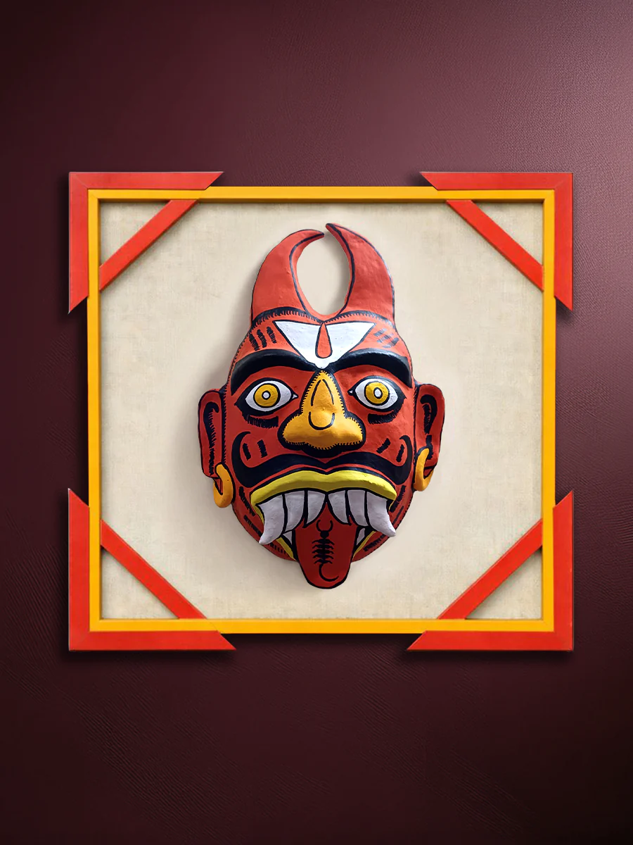 A dramatic framed folk-art mask featuring a vivid red face with intense yellow eyes, bold facial markings, and sharp tusks. Accented with a sculpted nose and symbolic detailing, the hand-painted piece reflects the powerful expressions of traditional theatrical art.