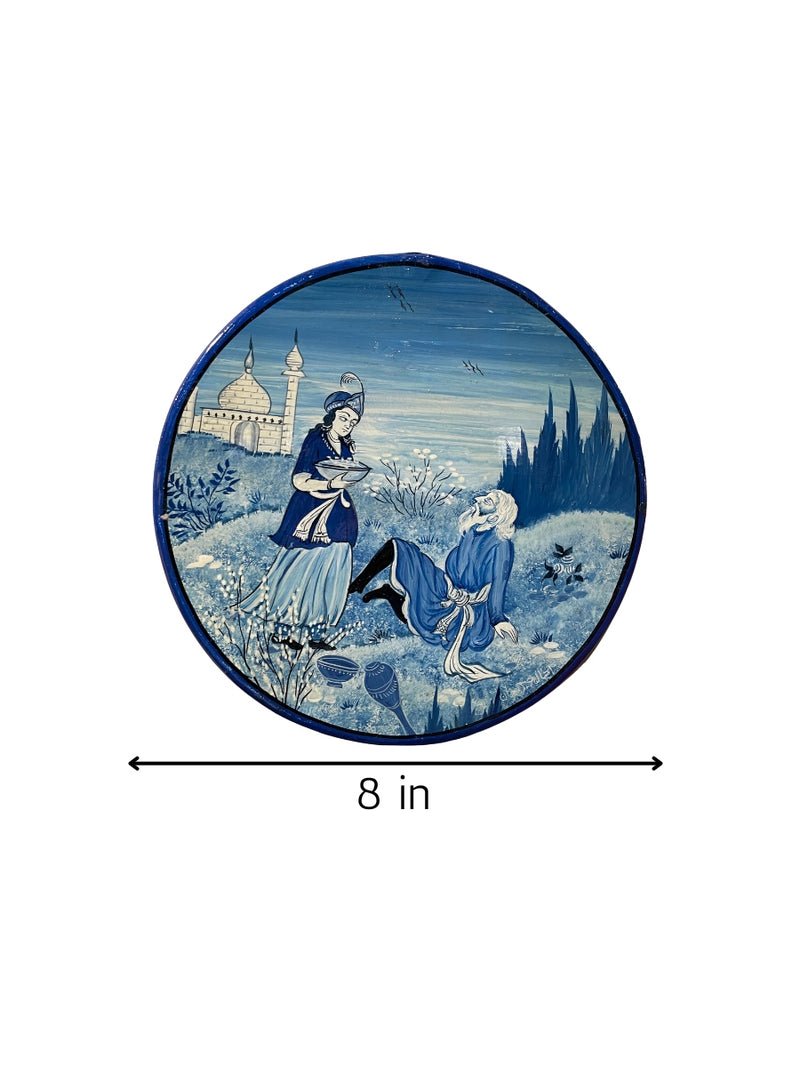 A charming blue-toned decorative plate depicting a serene outdoor scene of a woman offering a bowl to a seated man. Set against a landscape with trees and a domed monument in the background, the artwork features delicate detailing and a classic monochrome style reminiscent of traditional ceramic painting.
